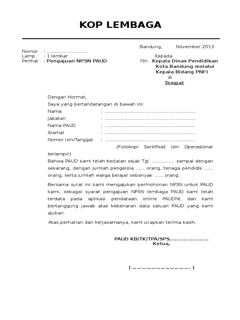 Contoh Surat Pengajuan Npsn Dr Lembaga